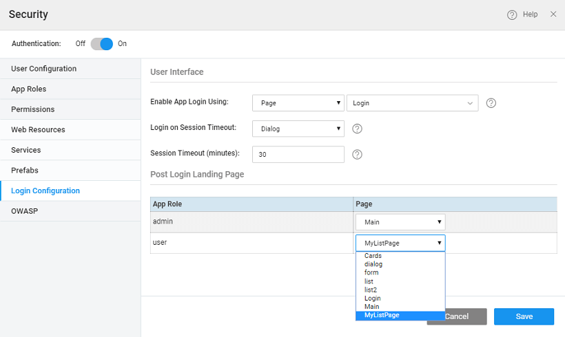 • Page: On session timeout, the user is redirected to the configured login page. Any page can be configured to redirect the user on session timeout.