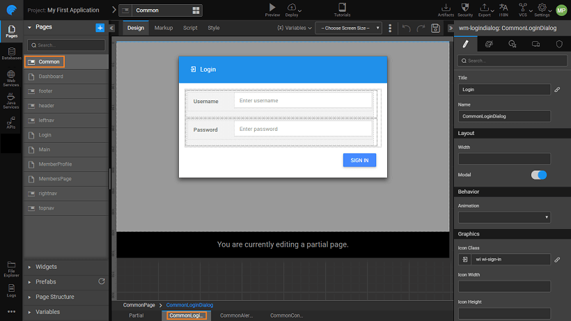 1. or using a login dialog pop-up provided by Studio. This dialog is present in the Common page as "CommonLoginDialog" and can be customized.