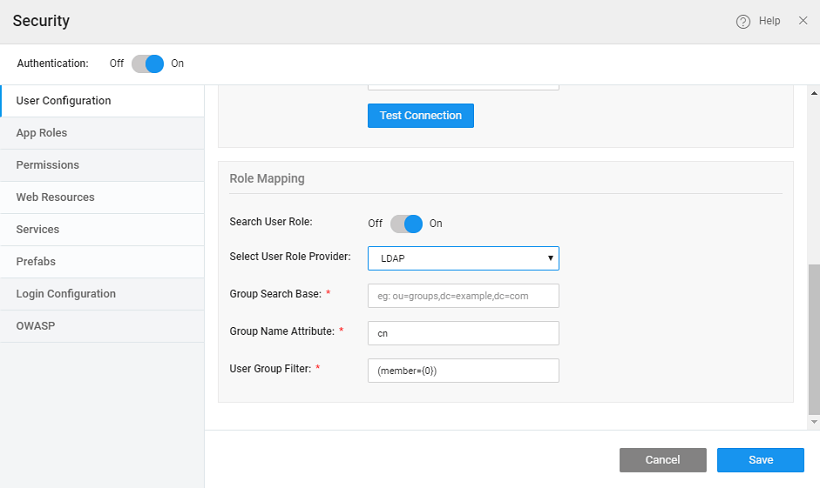 • Role Mapping: This will build the query to fetch the role values from the user table based on the logged in user details. See User Onboarding for more information.