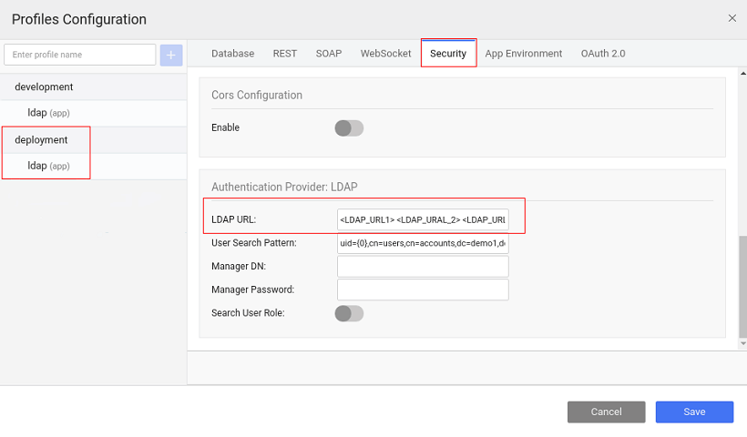 • LDAP URL: This field specifies the host name and port number of the LDAP server. This is the root node of which security will be able to use - ldap://localhost:389/dc=wavemaker,dc=com. For deployment profile, you can specify multiple LDAP server URLs, if required, by providing the multiple LDAP URLs as space-separated values, from the security tab of the Profile Configuration.