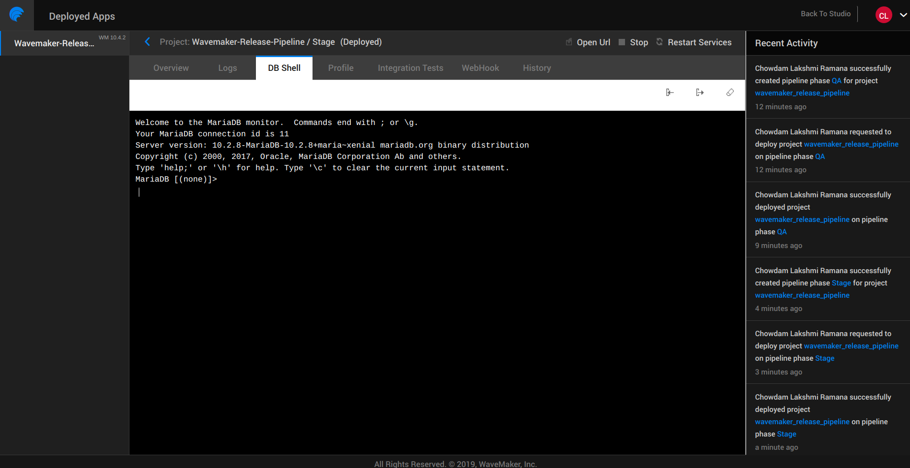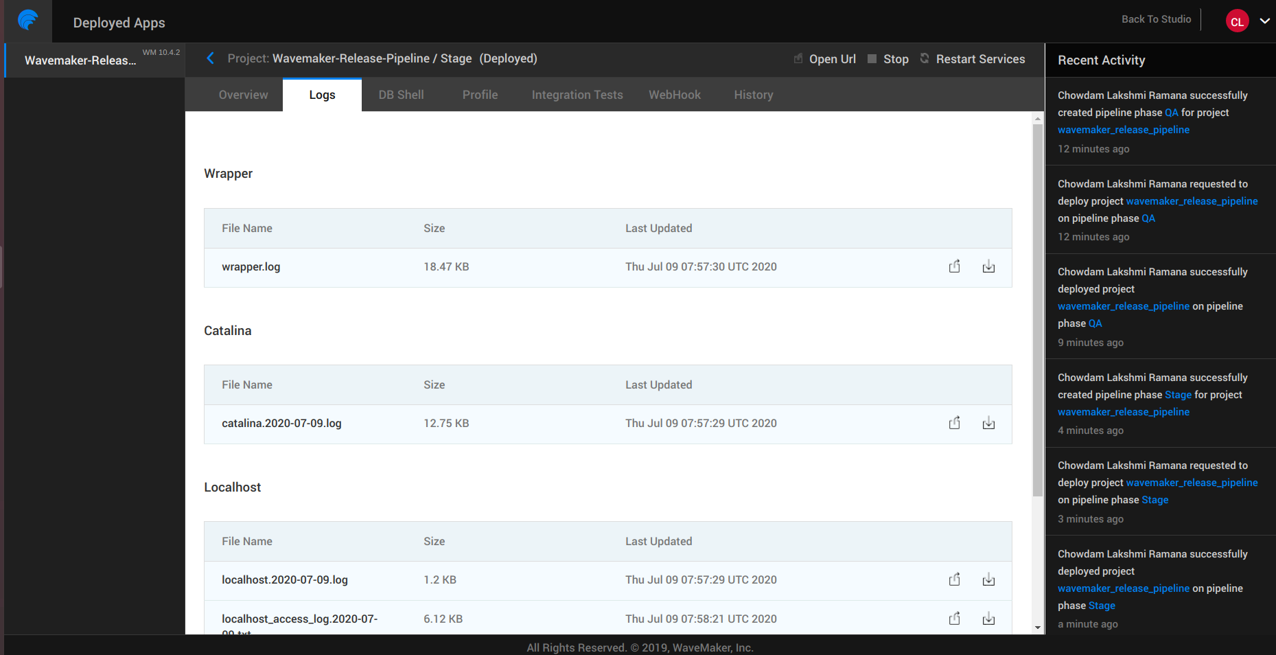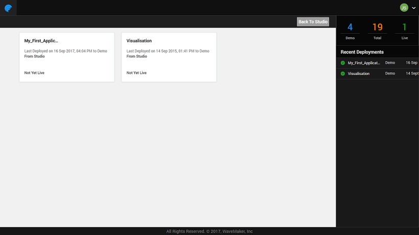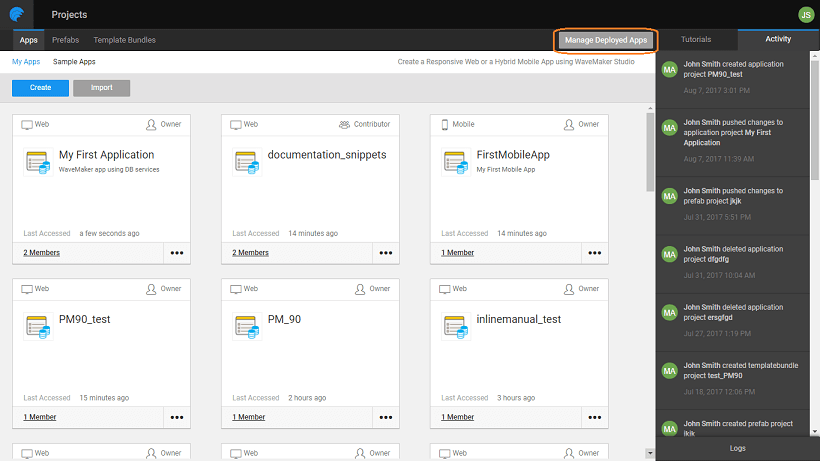 WaveMaker Apps Portal is a place for you as the project owner to manage the deployed apps. The one-click deployment from Studio hosts the app on WaveMaker Demo Cloud using the Deployment Profile. Apps Portal will enable the project owner to configure phases and push the apps from one phase to the next. From this portal you can: