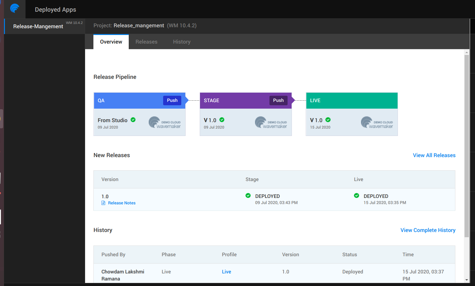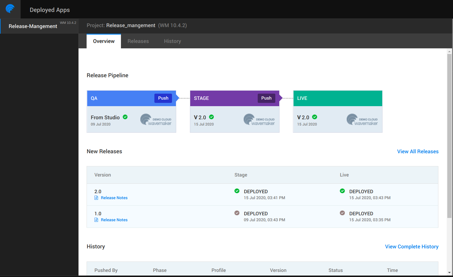 Once application is deployed, you can view the current release along with release notes and the latest history. You can view all releases/history.