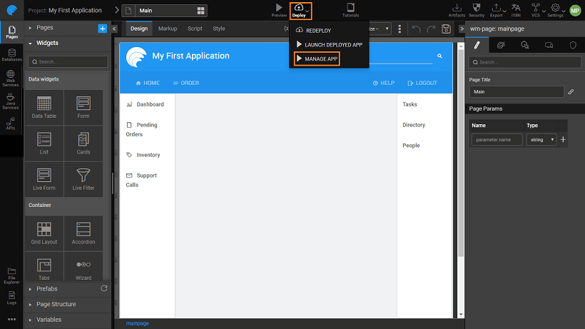 2. By using the Manage App option under Deploy from the Project Workspace Main Menu - this will open the app for management.