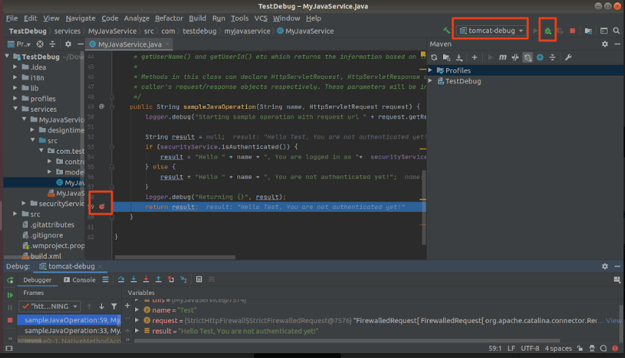 4. To debug any DB/Java service used in the app you need enable debug point in service and run it.