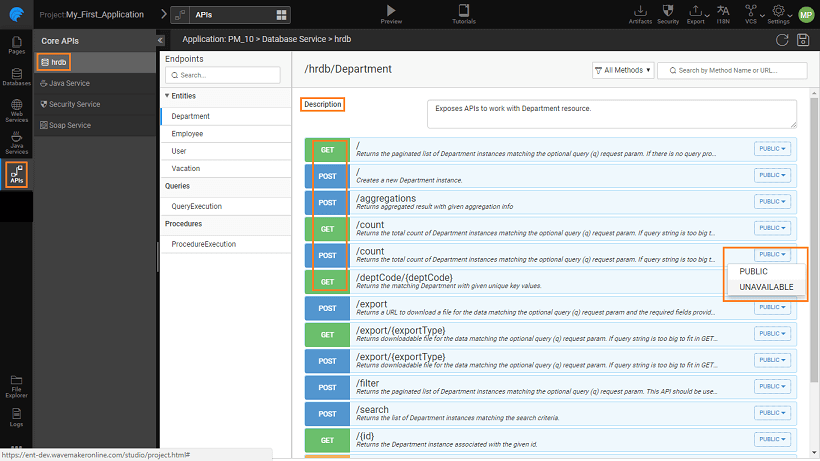 - Unavailable - this setting can be used when you want to disable a particular API method. For example, you want to ensure that records from employee table are not deleted, then making the DELETE method Unavailable will ensure that it does not happen by mistake.