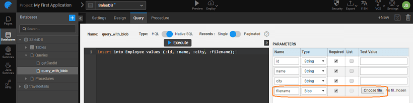 - Separate API will be generated for each Blob field with a Downloadable return type in addition to the executeQueryAPI. The response of the execute query's Blob field's value will contain the absolute URL to the Blob content. It will be null for the rows which do not have a value for that field.