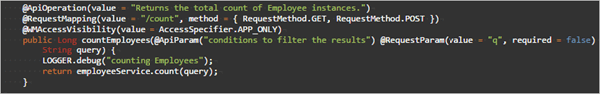 APIs that use HQL Queries: The Filter, Count and Export API in every Table Controller will use the HQL query, which is an optional parameter, for retrieving the data. These APIs can be found in respective tables’ controller class file.