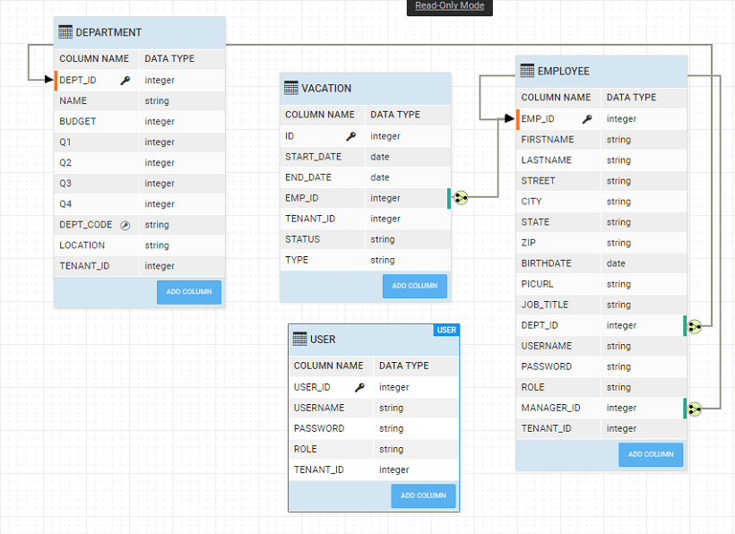As an example, we are using the following Employee-Department Database Schema (Sample hrdb that can be imported into Studio) with a unique constraint for Dept_code on the department table: