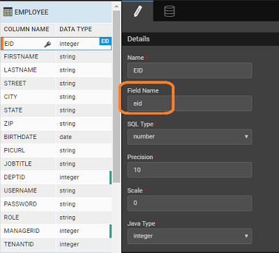 • The fieldName refers to the name of the field associated with the column in the respective table. The field name is derived from the column name in the table and usually camelCased.