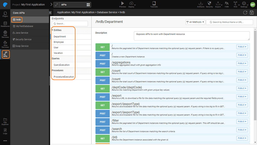 In case your external database schema comes without a primary key, you need to assign a column(s) as virtual primary key else all the columns are treated as part of a composite primary key. For each entity imported, a REST API is generated for each of the CRUD operations, Filter and Count functionalities. These REST APIs are exposed via the API Designer and can be tested and reconfigured as per the application needs.