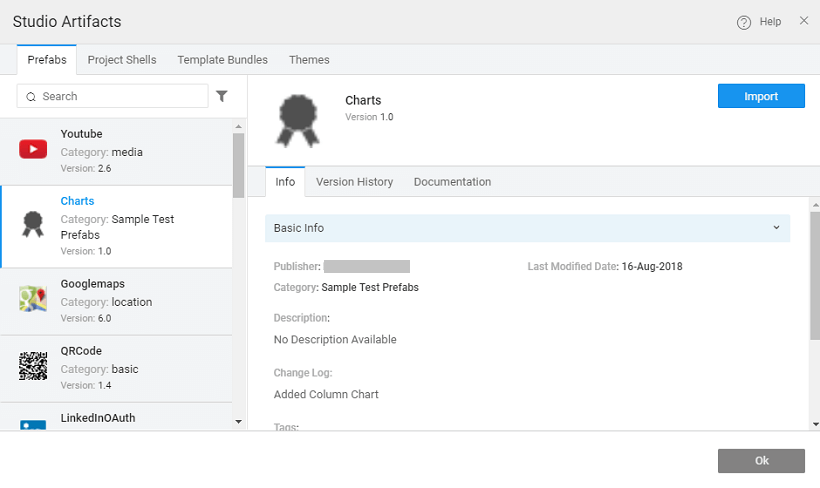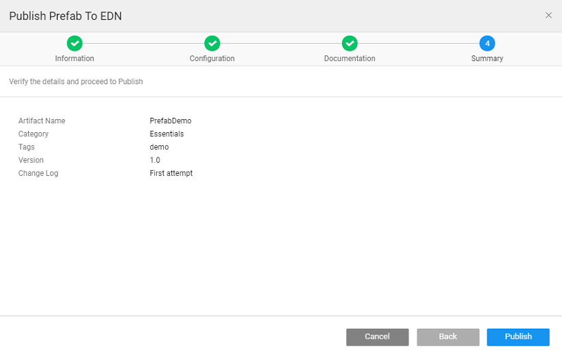 1. Publish Info: This requires the Developer to enter the Category, Version, and Change Log. In case this Artifact uses or has a dependency on other Artifacts (for example, Project Shell using a Prefab), the dependencies are listed here.