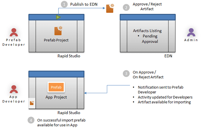 • Publish to EDN (only for enterprise version) – Approval by EDN Admin. Once approved, Prefab has to be explicitly be imported for use within an application.