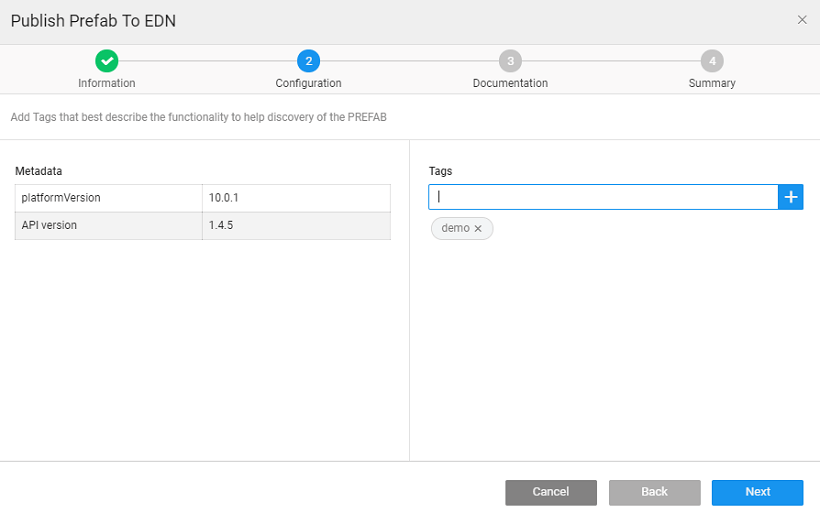 1. Documentation (only for Prefabs): This is populated automatically by the platform, from the Configuration Settings entered at the time of the Prefab development. Any changes to this need to be done at the Prefab development time.