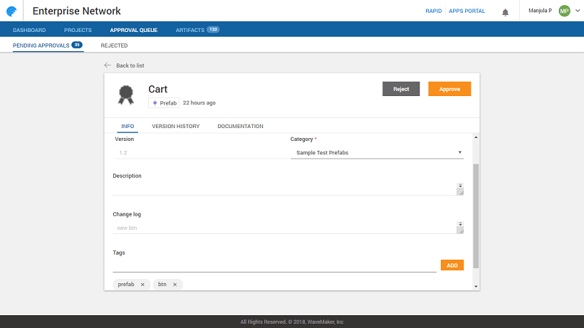Artifacts Pending Approval can be selected, reviewed, and approved or rejected. For both Approve and Reject, the reason can be entered under Remarks. This will be appended to the Version History and in case of rejection, the developer can act upon it accordingly.