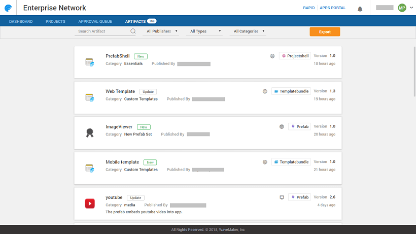Artifact Repository is a collection of artifacts or resources used across application development lifecycle in WaveMaker platform. It allows for easy exploration and discovery of Artifacts available to the developer network. These artifacts include: