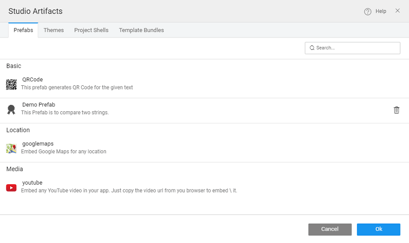 • Prefabs: Prefabs are a collection of one or more widgets that are bound to APIs or services.