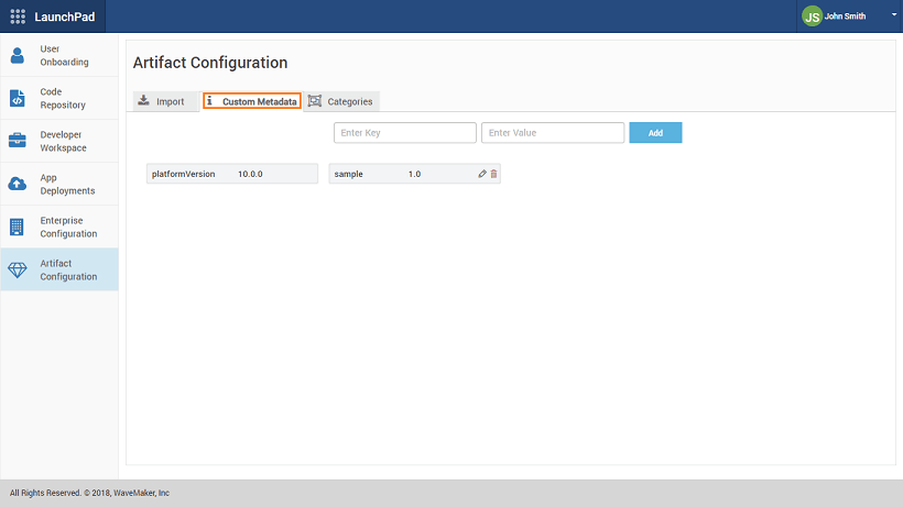This information is used to identify Artifacts based upon say the platform version and so on. Define the Key-value pairs and add. All Artifacts developed will get this data attached.