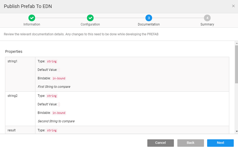1. Documentation (only for Prefabs): This is populated automatically by the platform, from the Configuration Settings entered at the time of the Prefab development. Any changes to this need to be done at the Prefab development time.