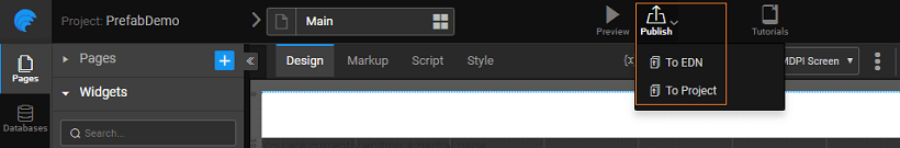 • Publish to Workspace (only for non-enterprise version) - Once published to workspace the Prefab will implicitly be available for use across all projects within the developer's workspace.