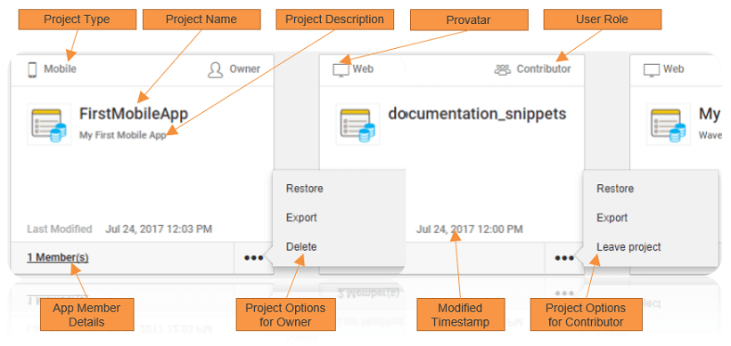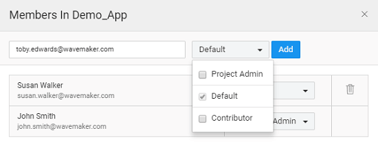 • Contributor: Contributor is the co-developer of the specified Project. They have full access to app development functionality, with the following exceptions: