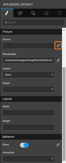SourceThis property specifies the source for the picture. The source can be either a file or a URL - File: enter the directory and filename for the image to display (supported file types include .jpg, .gif and .png). By default, WaveMaker looks for images in the src/main/webapp directory of the project. Every WaveMaker project has a data directory under src/main/webapp, so this is a good place to put pictures. - URL: enter a URL to any internet-accessible image. To display the file, foo.jpg, in the project directory src/main/webapp/resources/images/imagelists/, enter the following into the source property:resources/images/imagelists/foo.jpg or simply foo.jpg