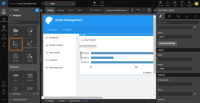 1. Go to the page layout of your application and drag-and-drop the required chart widget. Here, we are creating a column chart.