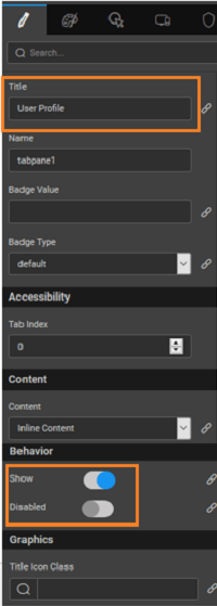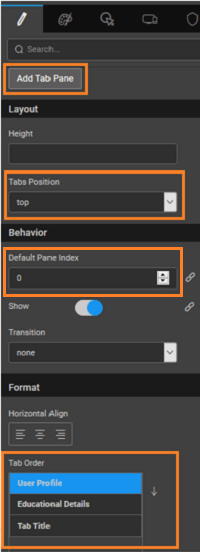Default Pane IndexThis property sets the default active pane on a load of the widget based on the provided index. The Tab Index is an integer starting from 0, 1, 2, and so on. That is, setting this property to 0 will display the first Tab pane; setting to 1 will display the second Tab pane.