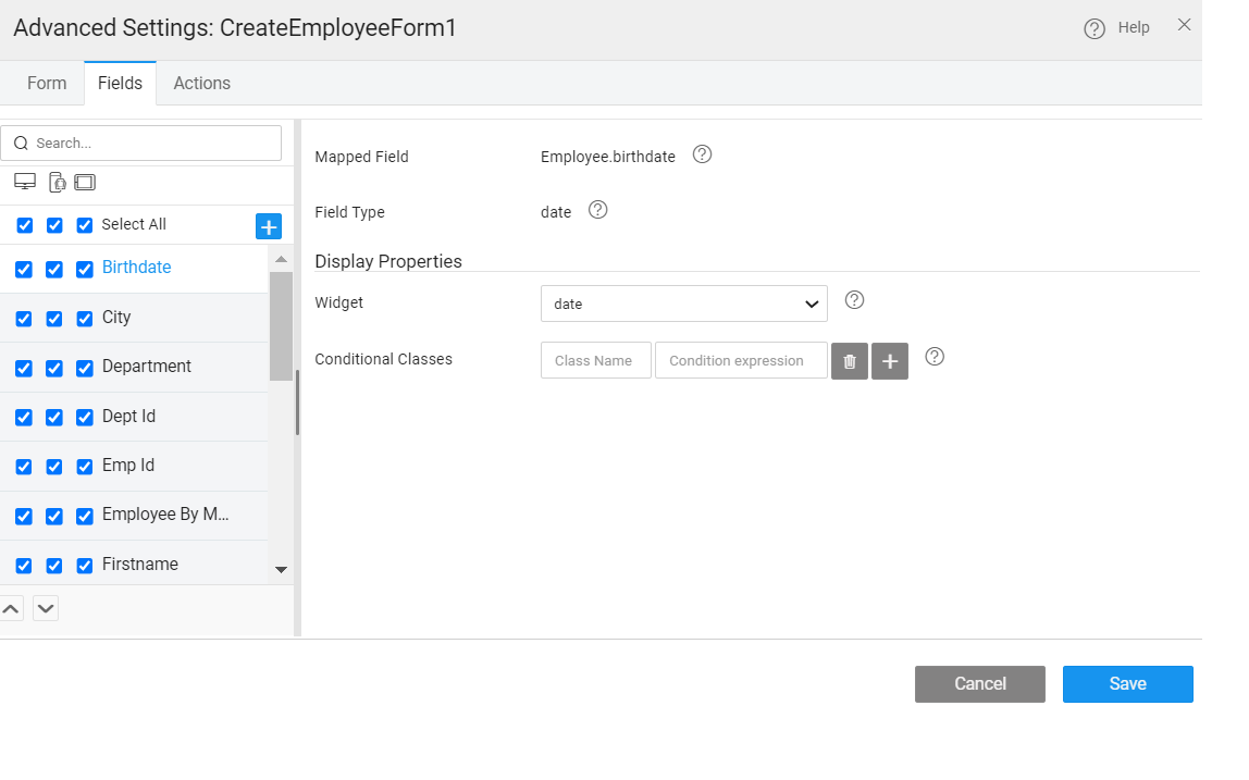 - modify the behavior of individual fields, from the canvas, by selecting any field on the form and setting the properties: