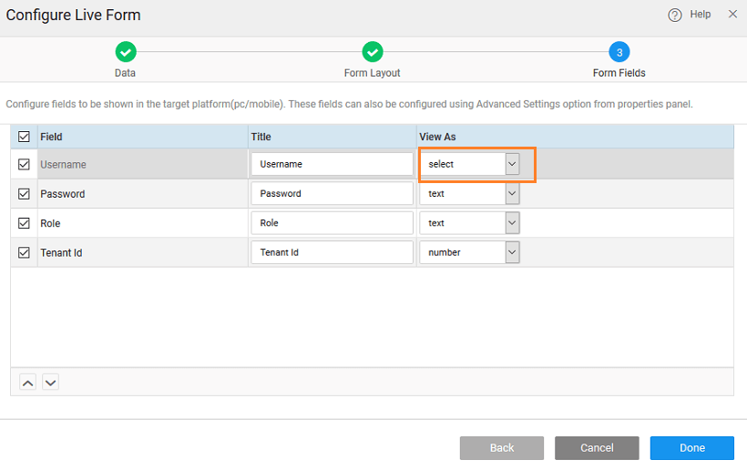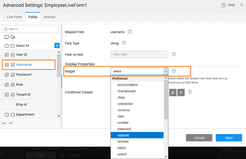 2. specify the widget to be used to represent each data field. Based on the data type of the field, the available widget options would vary.