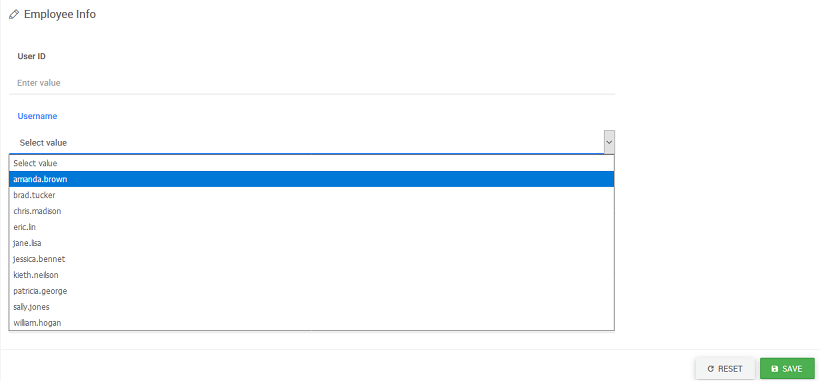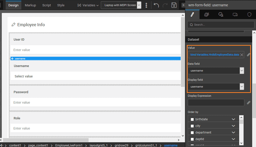 5. The dataset for the form field widget is auto populated with the Variable Dataset field. Data field and display field is set to field’s key. Here, the dataset value can be bound to any other variable or widget.