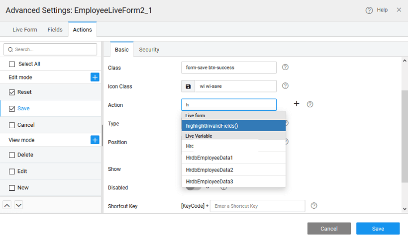 6. You can invoke the hightlightInvalidFields method on Save action from the Advanced Settings, to highlight all invalid fields in red and display appropriate error messages.