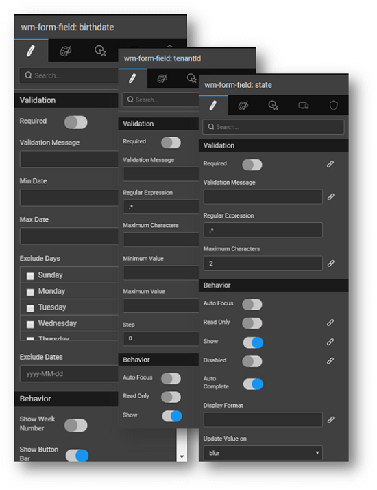 • behavior like Auto Focus, Read Only, Show etc can be set;