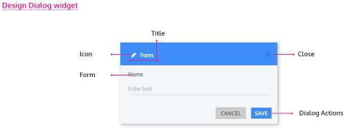 Design Dialog gives a Form for obtaining additional information from the user, like the name. It is a composite widget with Labels and Text widgets. It comes with two buttons Cancel and Save.