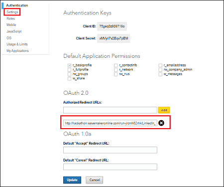 9. Go to LinkedIn Developers – your project page and click on Settings on the left side. Add the generated redirect URL below OAuth 2.0 and Click Update.