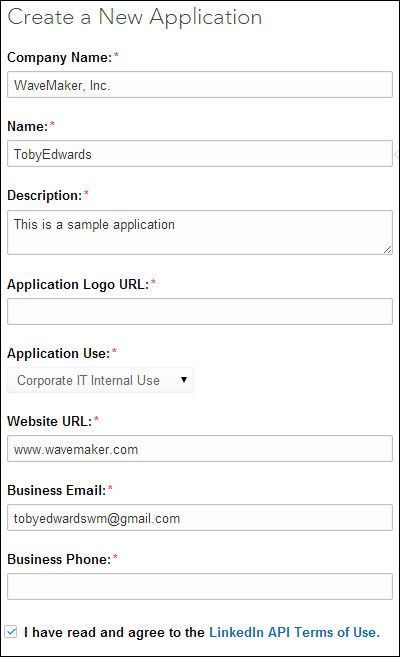 3. Enter Company Name, Name, Description, Application Logo URL, Application Use, Website URL, Business Email and Business Phone in their respective fields. Check the LinkedIn API Terms of Use checkbox and click Submit. Authorize Redirect URLs page is displayed.