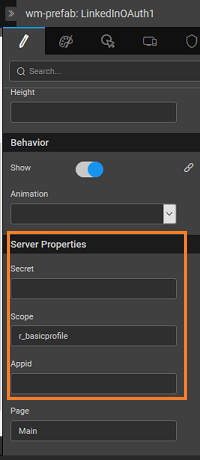 6. In the Properties Panel, below SERVER PROPERTIES, enter the Appid, Page, Scope and Secret in their respective fields.