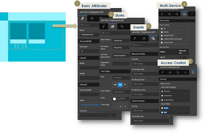 Define the content to be displayed in a widget by connecting it to a database query, web service, Java method, or another widget. Data binding provides integration with data sources known as ‘Variables’ or any other Widgets. Variables offer the ability to integrate with services such as a database, web service or any other backend service. More on Variables and Binding.