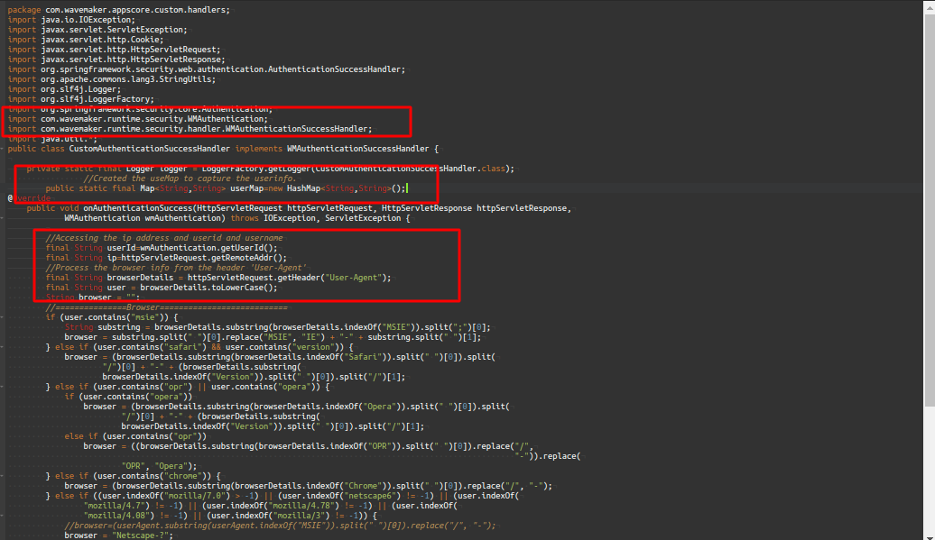 Create these classes in an IDE and copy it in the path specified in the above screenshot in the CustomAuthenticationSuccessHandler.java file. For more information, see working with IDE.