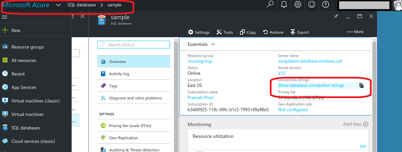 3. Click on show database connection strings
