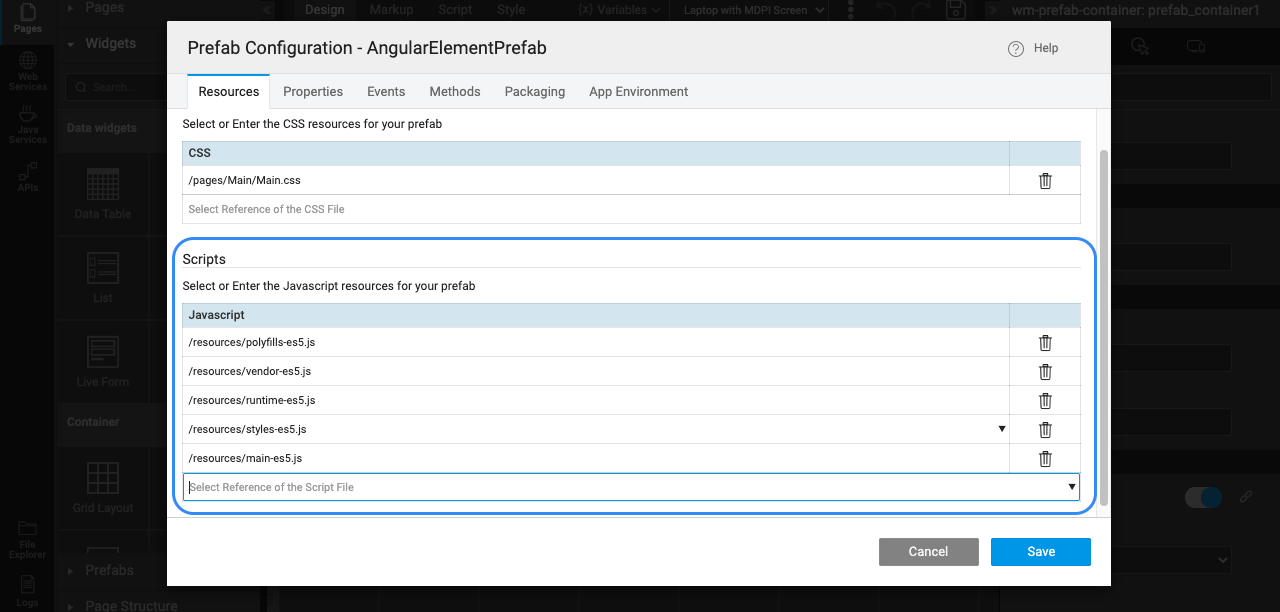 • From the Project Screen, choose Config Prefab under Settings. In the Resources tab, update Scripts with the JS file imported in the previous step. As we are rendering React elements inside out custom element wrapper, we should import React & React DOM libs as well.