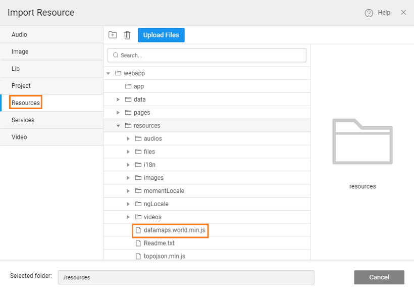 resourcesfolder and upload thetopojson.min.jsanddatamaps.world.min.jsfiles.