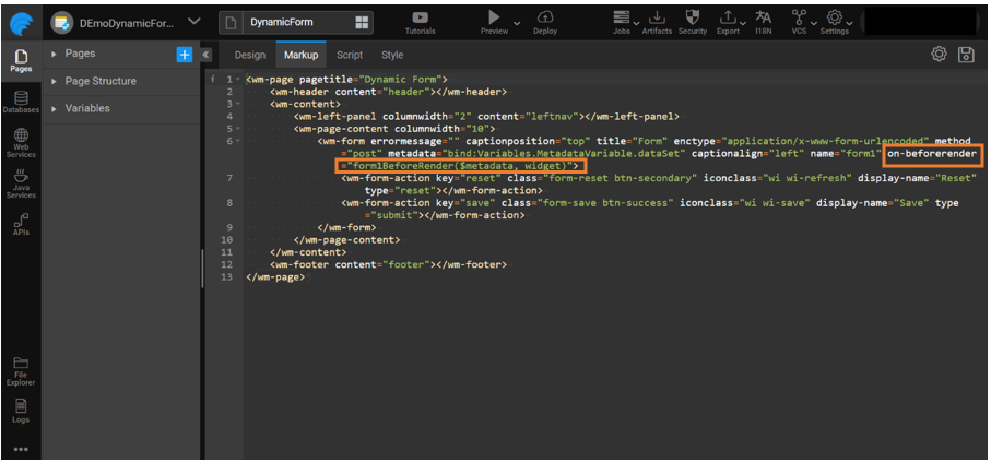 In WaveMaker Studio, Form expects the metadata in a particular format given in Dynamic Forms in WaveMaker. Use the on-beforerender event to modify the metadata returned from API into the metadata the Form expects in the Markup, as shown below.