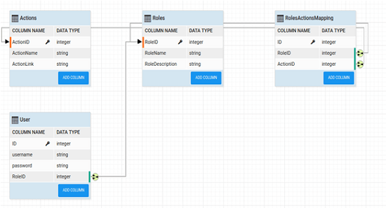 1. Please make sure that you configure the security in the application with the database. We are using a sample database with Actions, Roles, Users, and RolesActionMapping entities.