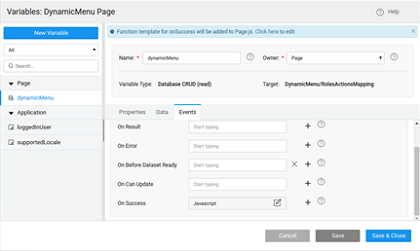 3. Navigate to the Events tab for the variable and choose JavaScript as the operation for the onSuccess event as below:
