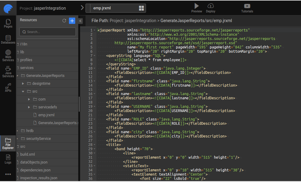 2. The following sample report jrxml is provided for your reference which loads the data from hrdb Employee table and generates the report.