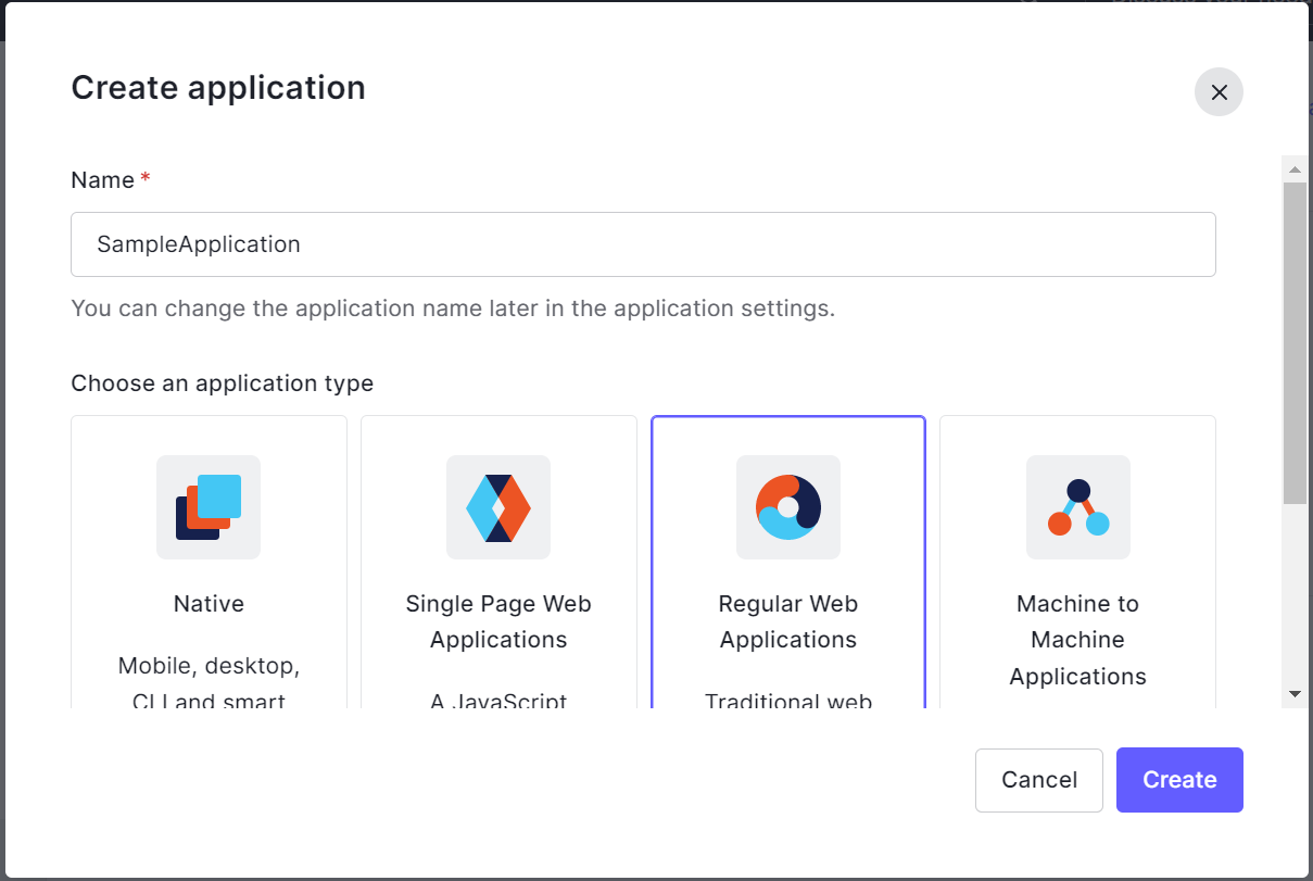 1. Click Create Application to start creating an application. Enter the Application name and click Regular Web Application to create a web application.