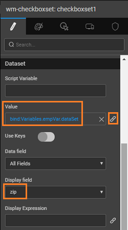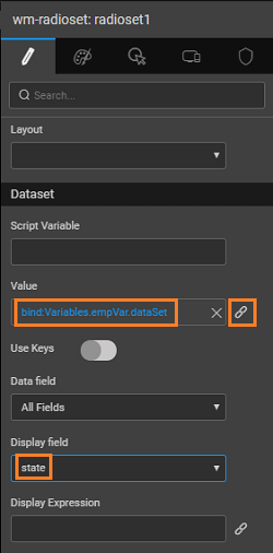 8. Bind variable data city, state and zip to the selected values of Select, Checkboxset and Radioset widgets.
