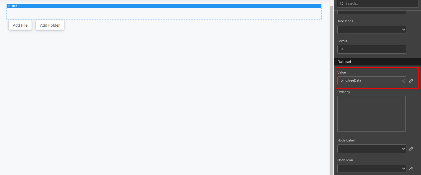 1. Select the Tree widget. Go to Value property and click the bind icon under the Dataset section. Go to the Use Expression tab and set the script variable as treeData.