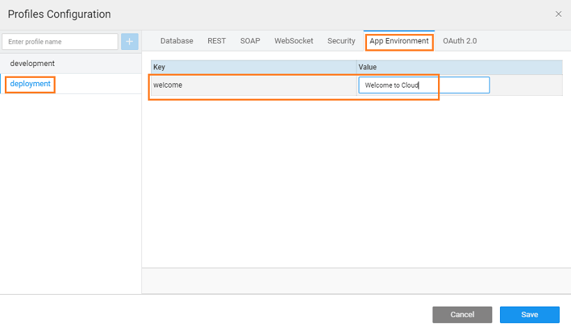 This property, when deployed with development profile, will have the value “Welcome to WaveMaker” while when deployed with deployment profile will have the value “Welcome to Cloud”