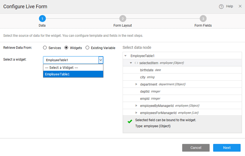 3. You can select data node to be the entire widget or the selecteditem node in case of another Data Table or List or Cards or result from a Live Filter